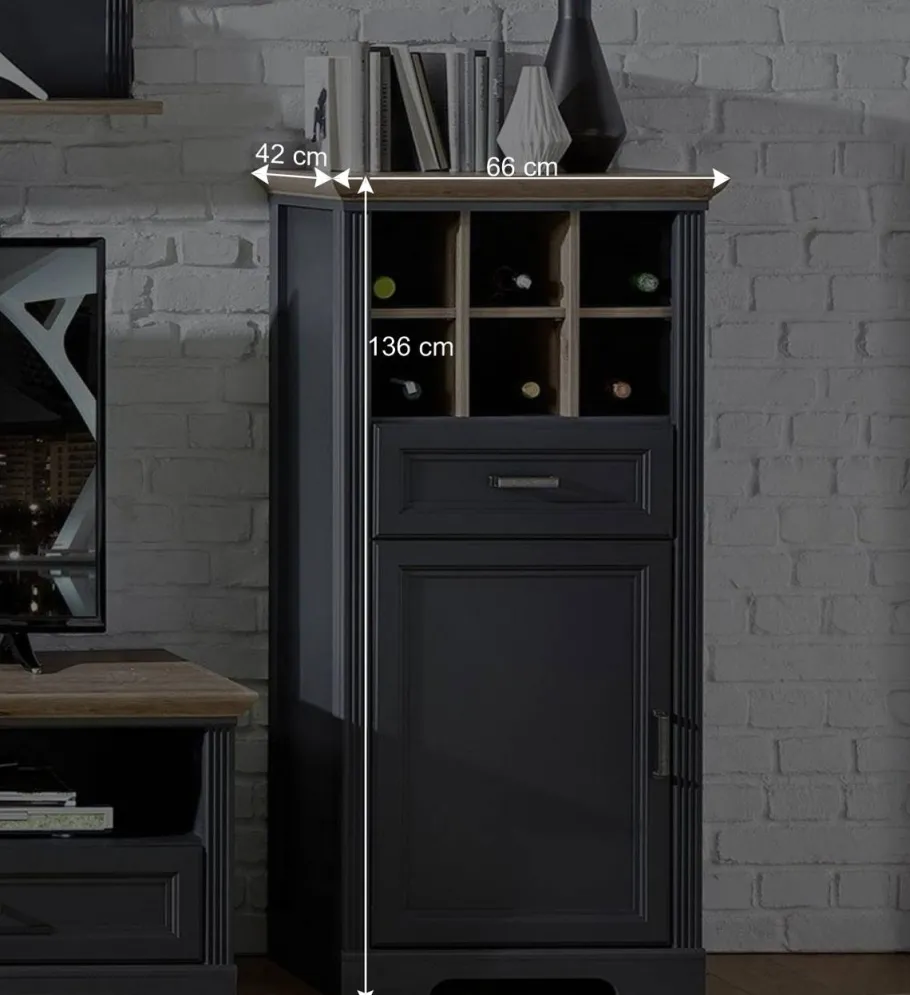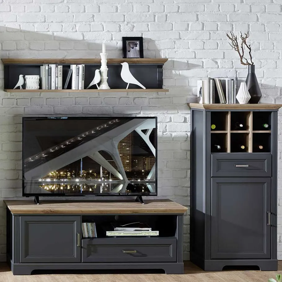 - Exzellente Wohnwand in Dunkelgrau und Eichefarben