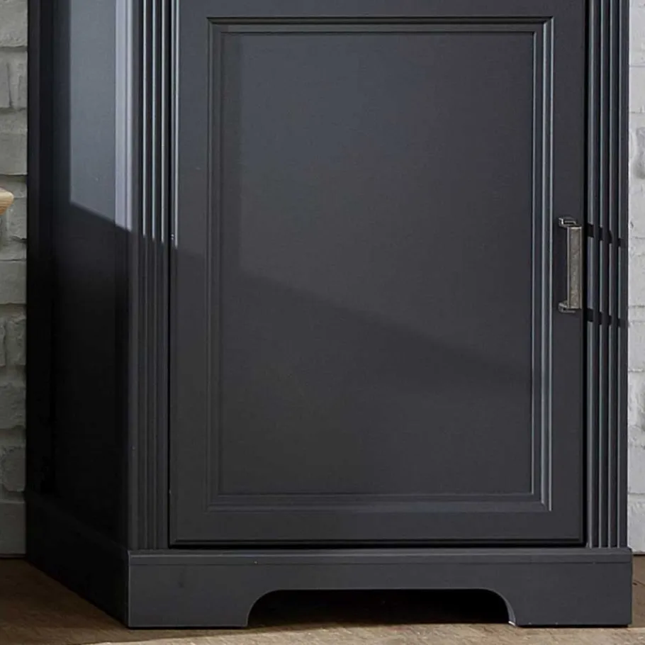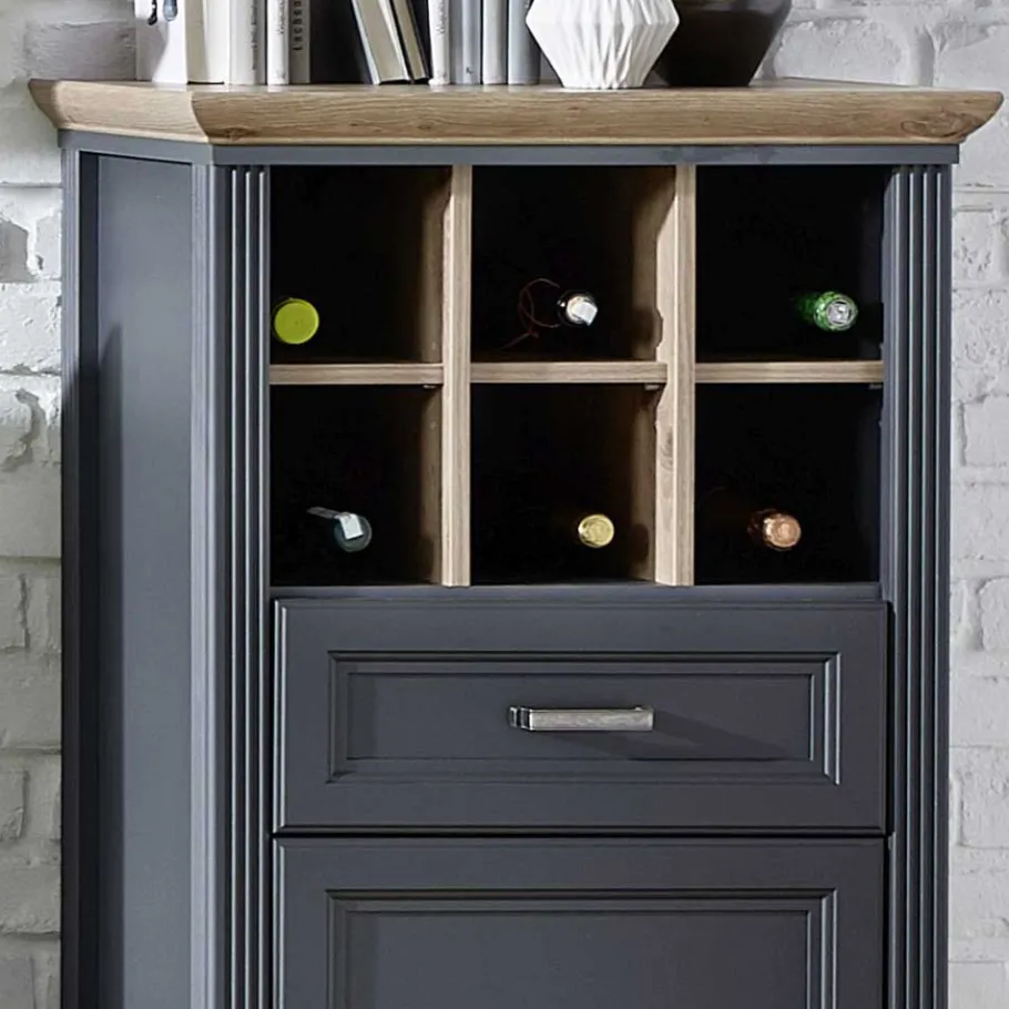 Jedes Detail der „Thumbs“ Wohnwand wurde sorgfältig durchdacht. Die dekorativen Fräsungen an den Frontseiten und die eckigen Korpuskanten fügen sich nahtlos in das Gesamtbild ein. Die Türen sind mit einer Dämpfung an langlebigen Metallscharnieren ausgestattet, die für eine sanfte Handhabung sorgen. Die Schubladen gleiten auf Metallauszügen mit Unterflurführung und sind mit Selbsteinzug sowie Soft-Close-Funktion ausgestattet, für ein leises und leichtes Schließen. Die Metall-Bügelgriffe im Antik-Look verleihen den Möbelstücken einen zusätzlichen Hauch von Eleganz und Geschichte.