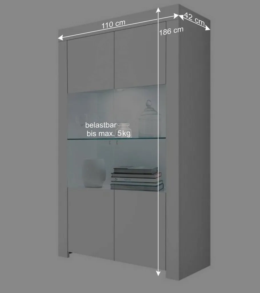 - Innen zwei Einlegeböden, je bis maximal 10 kg belastbar, mittig ein Glasboden, belastbar bis maximal 5 kg