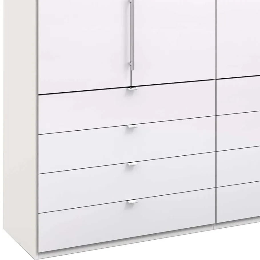 Darüber hinaus bietet der Kleiderschrank „Dolienca“ zwölf großzügige Schubladen mit einer Breite von jeweils 100 cm. Dank des Metallauszugs, der Soft-Close-Funktion und des Selbsteinzugs lassen sich die Schubladen mühelos öffnen und schließen. Elegante Kantengriffe aus Metall verleihen ihnen eine ansprechende Optik.